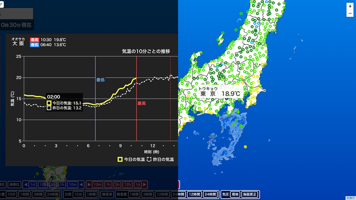 また、個別観測点の今日と昨日の気象情報の10分ごとの変化をグラフに表して見ることができます。