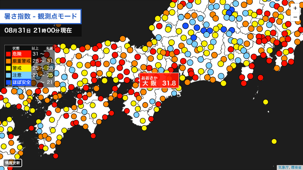 では、夏に活動する際の指針となる、暑さ指数(WBGT)を地図に表示します。