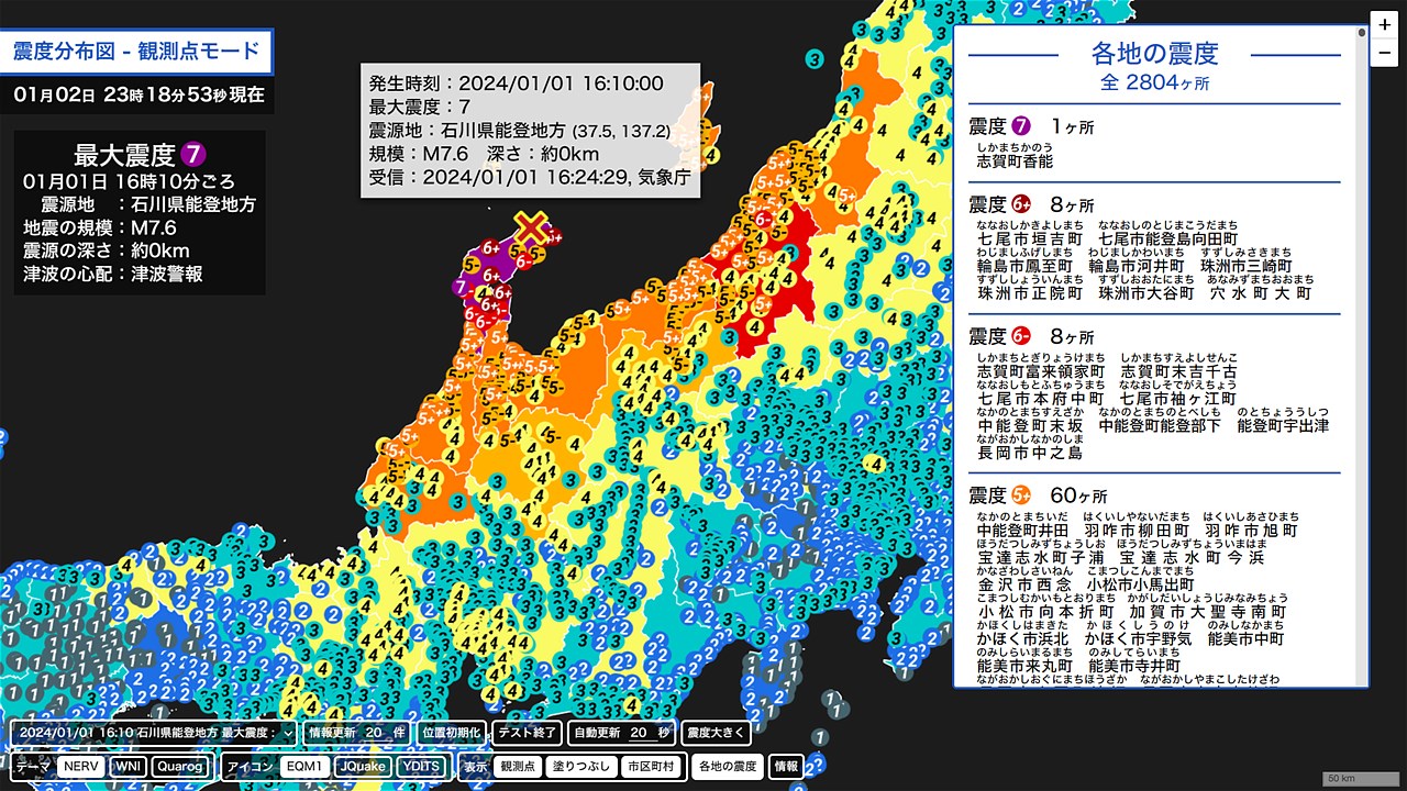 では、観測された震度の広がりを地図に表示するため、直感的に掴むことができます。