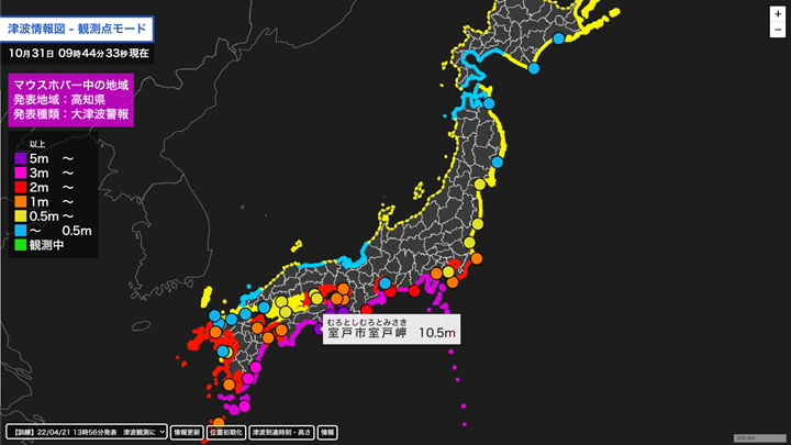 では、観測された津波の高さや発表されている津波警報・注意報などを地図に表示します。