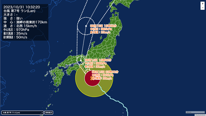 また、必要な情報を横に表示する機能があり、台風の発達や衰退の予想を一目で見ることができます。