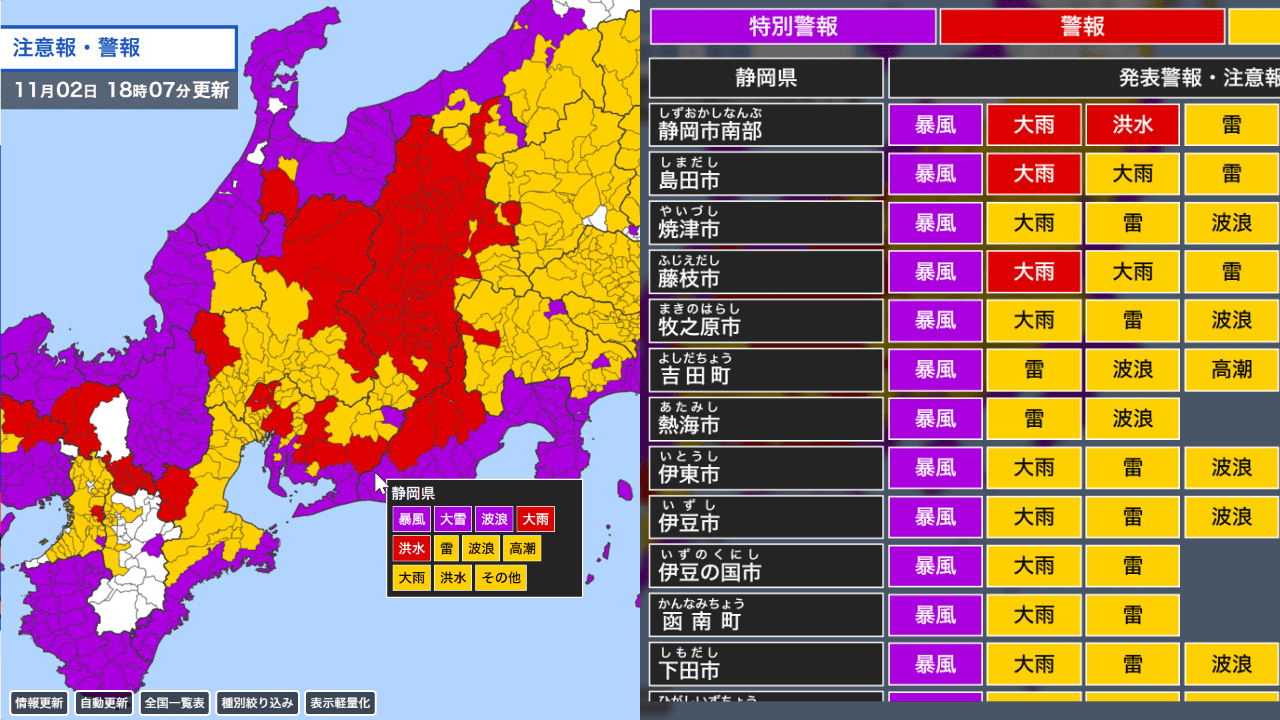 また、都道府県ごとに発表されている気象警報・注意報を一覧で見ることができます。