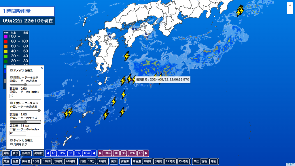 時間を前後させる動作をした際は、「更新」ボタンを押して最新の時刻に戻すまで、雷レーダー機能は使用できません。