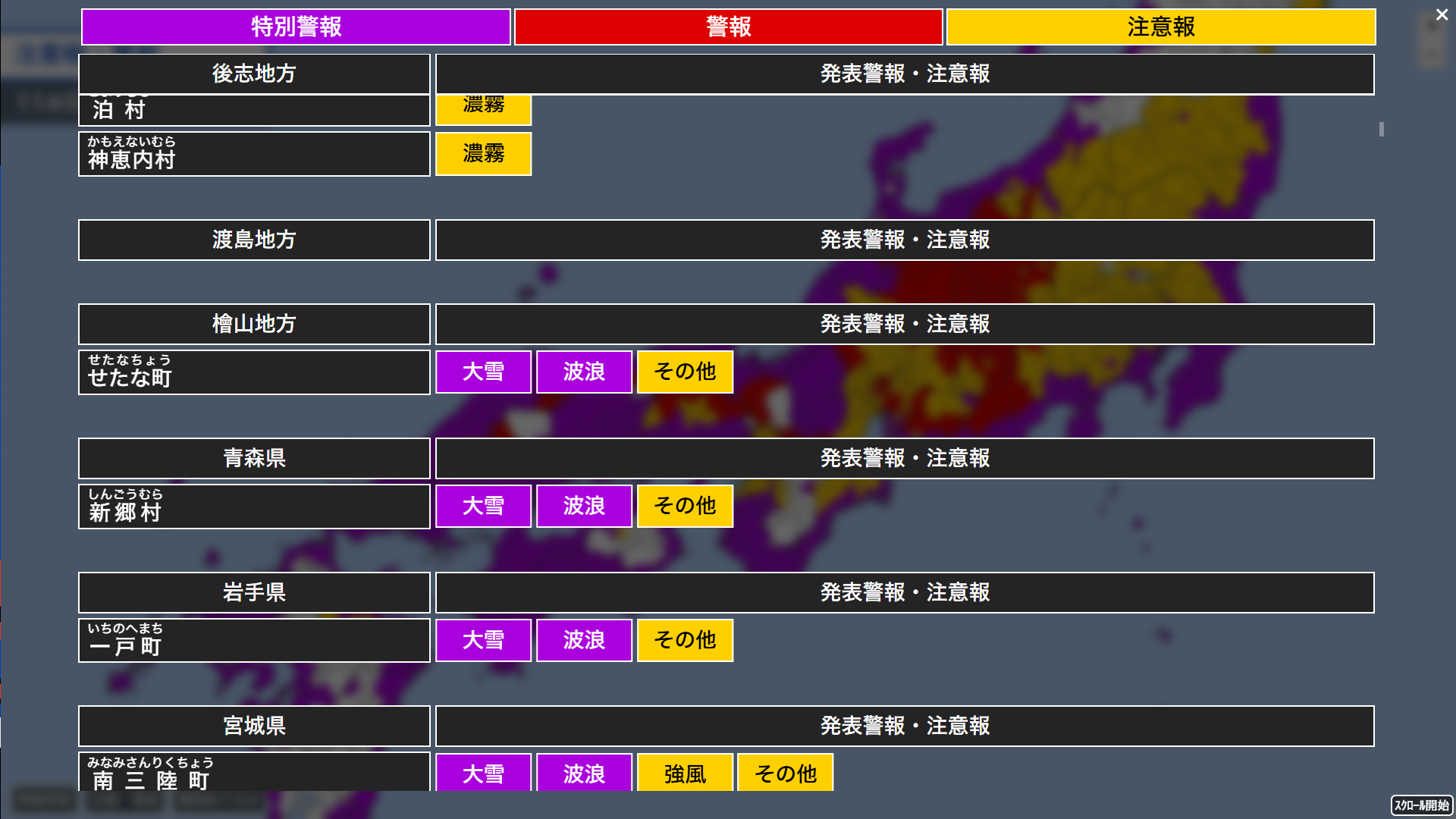 全国の市区町村で発表されている気象警報・注意報を全てまとめて表に出力し、一括で見ることができるようになりました!