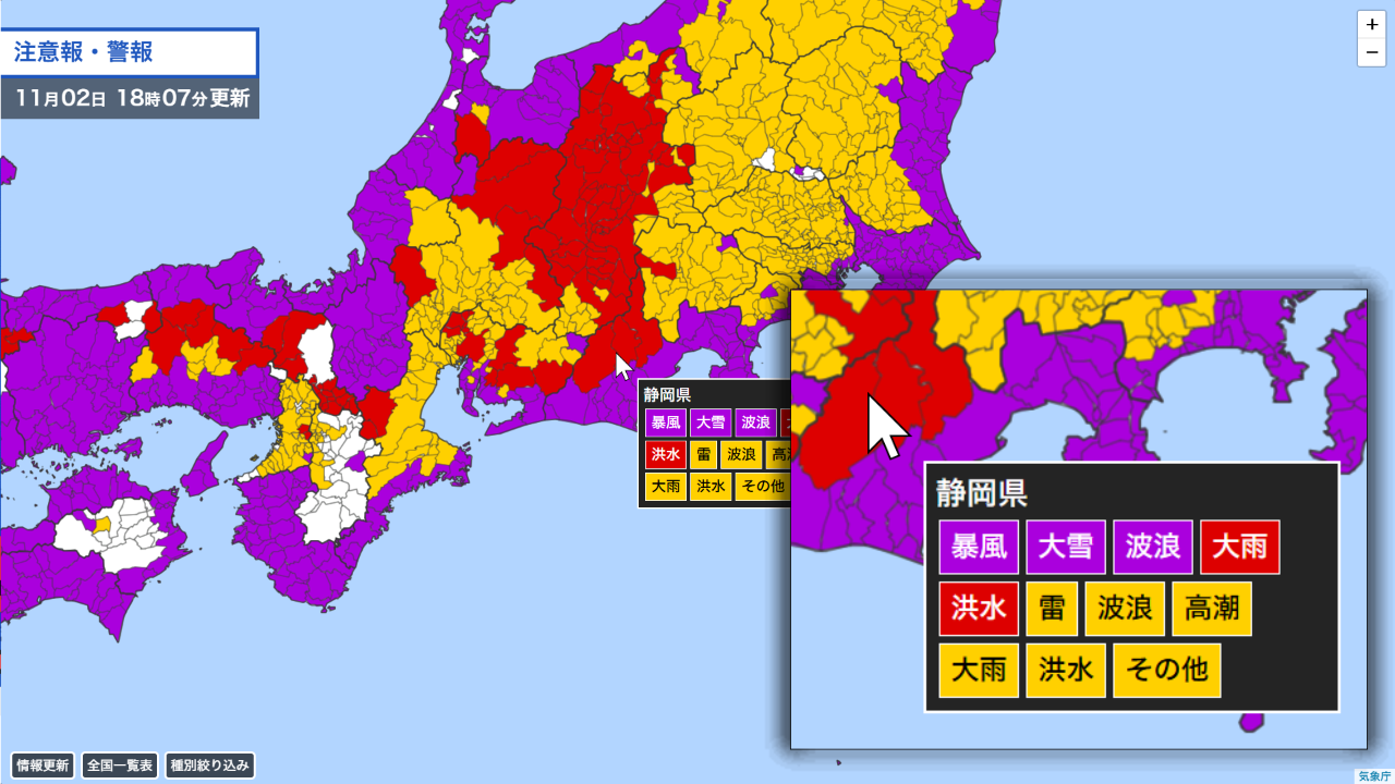 都道府県の上にマウスカーソルをホバーすることで、小さなポップアップが表示され、その都道府県で発表されている気象警報・注意報を簡易的に見ることができるようになりました
