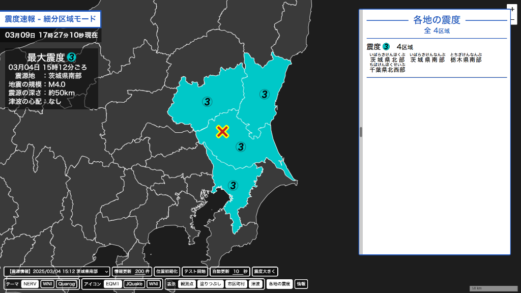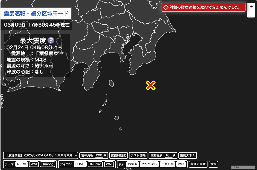 震度速報の条件を満たしていない場合は、右上に条件を満たしていない旨のエラーが出力されます。